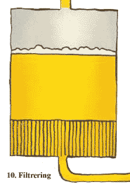 | 10. Filtrering Det färdiglagrade ölet filtreras sedan, så att alla jäsrester och andra partiklar avlägsnas. |