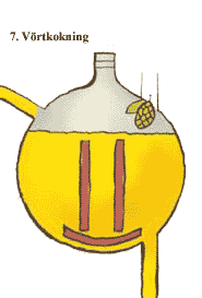 | 7. Vörtkokning Vörten kokas med Humle, som ger ölet både besk smak och längre hållbarhet. Efter kokningen silas vörten och kyls ner. |