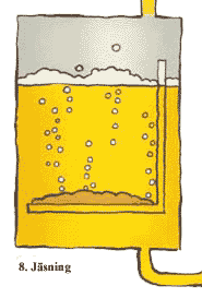 8. Jäsning I jäskaret blandas jästen direkt med den nedkylda vörten. Under jäsningen som kan vara mellan en till två veckor, omvandlas socker till alkohol och kolsyra. |